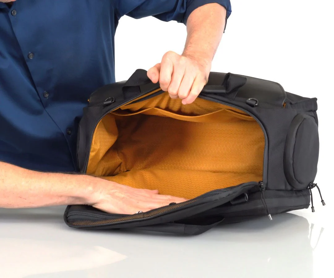 Working with customers who travel frequently, we set out to optimize the personal item allowed on most airlines. The result: the roomy, highly-organized Air Duffel for carrying headphones, neck pillow, water bottle, snacks, jacket, magazine, etc. A separate work compartment holds a laptop and work gear.Â